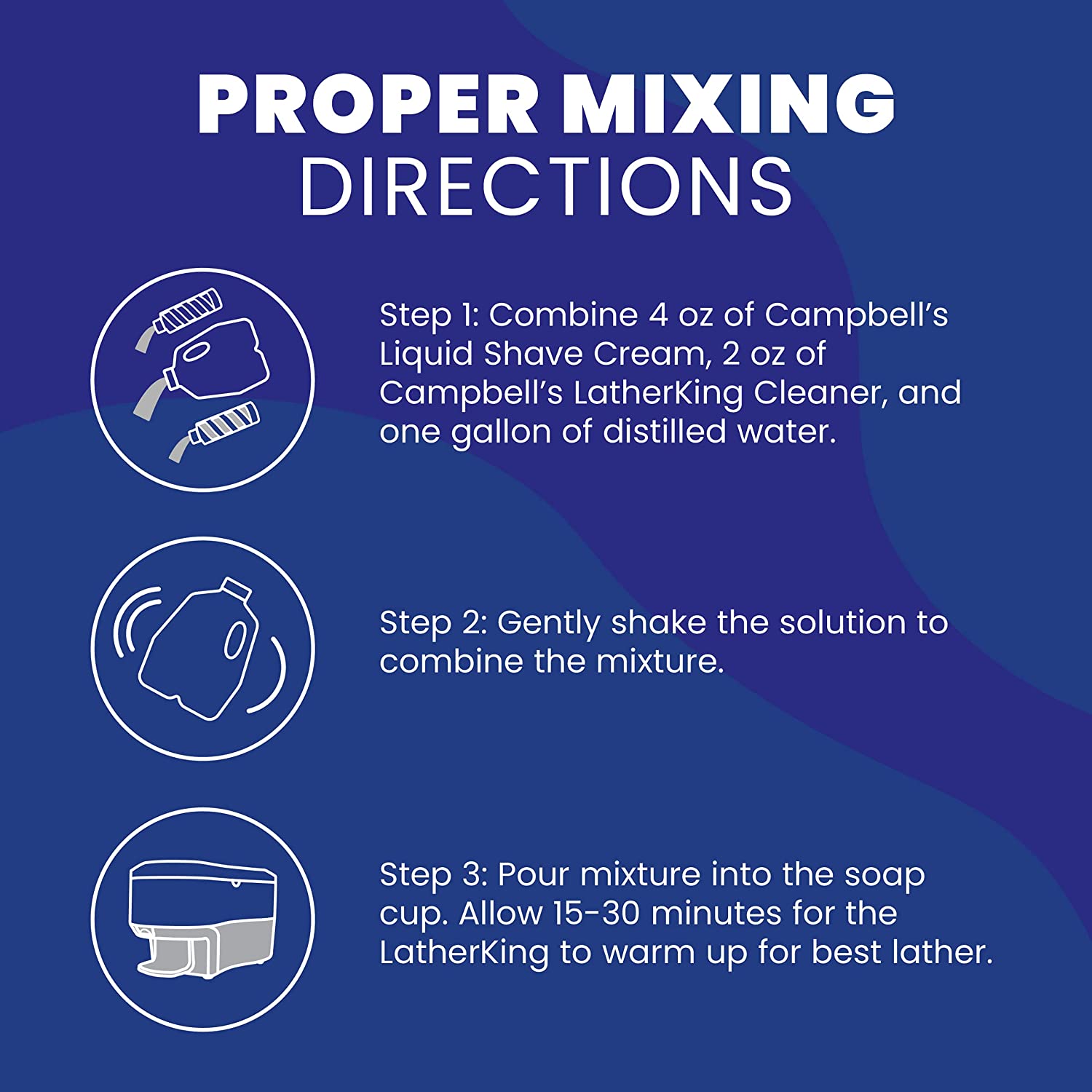 - INSTRUCCIONES DE USO DE LATHERKING: Combine la crema líquida para afeitar Campbell's, el limpiador LatherKing de Campbell's y 1 galón de agua destilada. Agite suavemente la solución para combinar la mezcla. Vierta la mezcla en la taza de jabón y deje que la espuma se caliente durante 15 a 30 minutos para lograr una espuma caliente y perfecta.