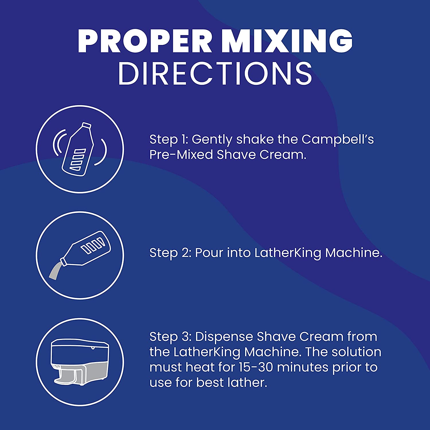 Cuando utilice la crema de afeitar líquida premezclada de Campbell en una máquina de espuma caliente LatherKing, siga estas instrucciones para lograr una espuma perfecta: primero, agite suavemente girando la botella boca abajo varias veces para asegurarse de que la solución esté bien mezclada y que el concentrado ya no esté en el fondo. Luego, vierta la solución en el recipiente para jabón LatherKing. Deje que se caliente el tiempo adecuado y opere normalmente para lograr una espuma perfecta. La separación del concentrado y el agua es normal durante el almacenamiento.
