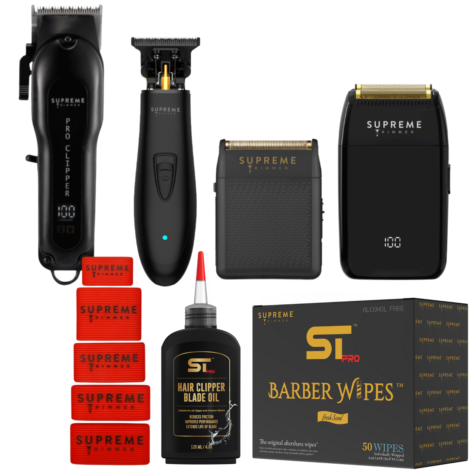 The Starter Deluxe Set is the ultimate all-in-one barbering toolkit to kickstart your journey. This 7-piece bundle includes a hair clipper, trimmer, foil shaver, oil bottle, clipper grips, and aftershave wipes—giving you everything needed for smooth, precise cuts and a professional finish. Perfect for beginners and pros looking to upgrade their setup.